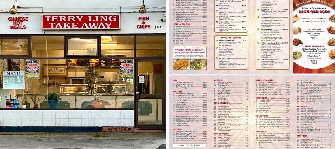 Discover the best of both worlds at Terry Ling's Chinese & Fish Bar in Earley! Enjoy crispy fish and chips and delicious Chinese takeout favorites like sweet and sour dishes and prawn crackers, all at unbeatable prices. Conveniently located at 394 London Rd, we offer a tasty menu for all cravings. Order now and experience the perfect blend of flavors!
